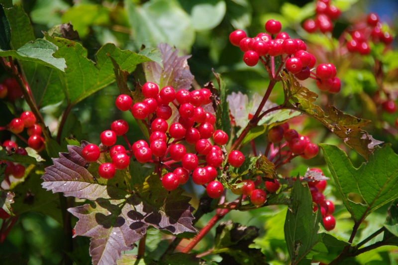 春に白くて細かい花の咲くカンボクは秋には赤くてきれいな実がなります。葉は広卵形で3裂します。5のように晩秋に葉が散っても実が残ります。