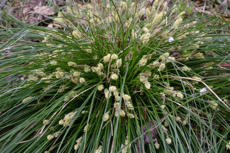冬でも枯れないスゲなので、カンスゲ。春先に真っ白な穂(雄花)が出てよく目立ちます。