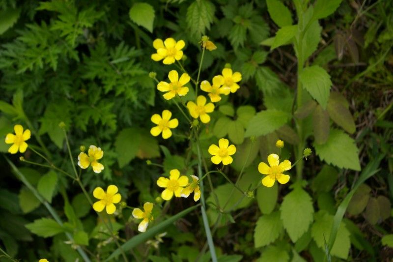 科名や属名に使われている名称、キンポウゲとも呼ばれます。5個の花弁が梅のように並んでいますが、