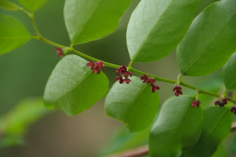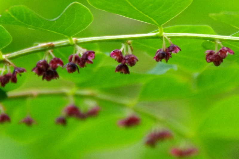 葉は互生し、卵形から楕円形。これが小判に似ているのでこの名がついています。葉腋に2〜4個ほどの暗紫色の花をつけます。雄花の萼片は4個。