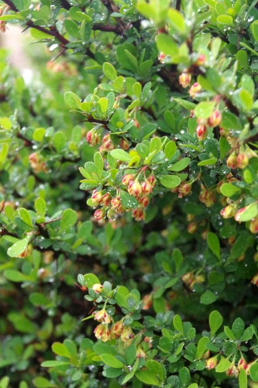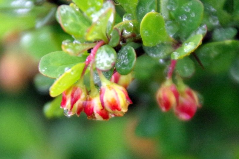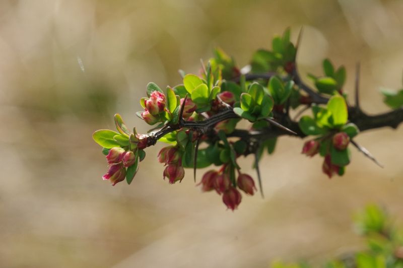 が付くメギの花です。花はツツジ科のスノキ属のものと似ていますが、茎に鋭い刺があるのですぐわかります。