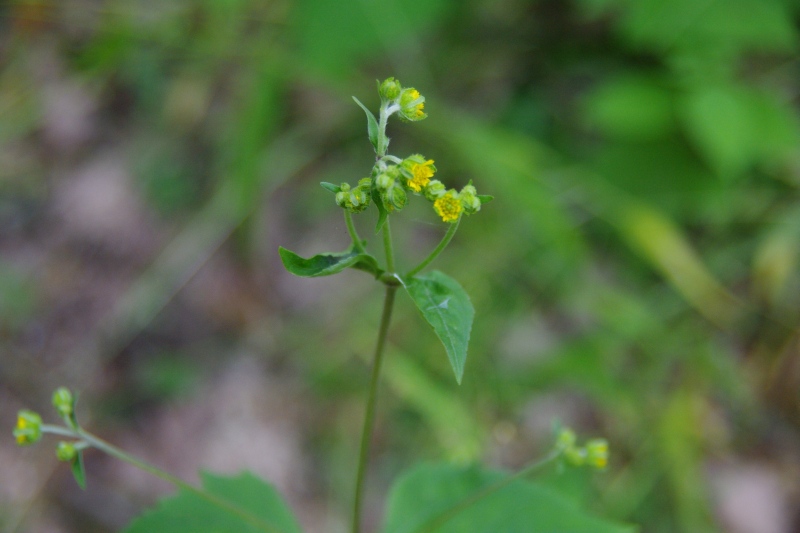 大型の一年草です。葉は卵状三角形で、葉柄には翼があります。黄色い頭花は小さく、2cm程度。