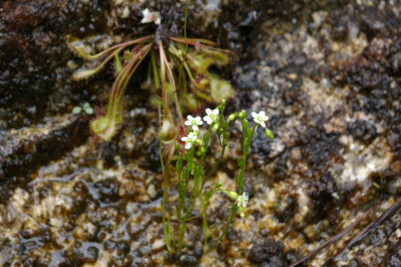 5、6でよく見える葉に生えた赤い腺毛が粘液を出して虫を捕えます。でも花は小さく清楚です。