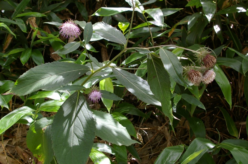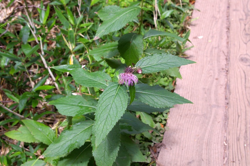 葉の棘も、ほかのアザミ類に比べるとマイルドです。総苞外片は反転または開出します。