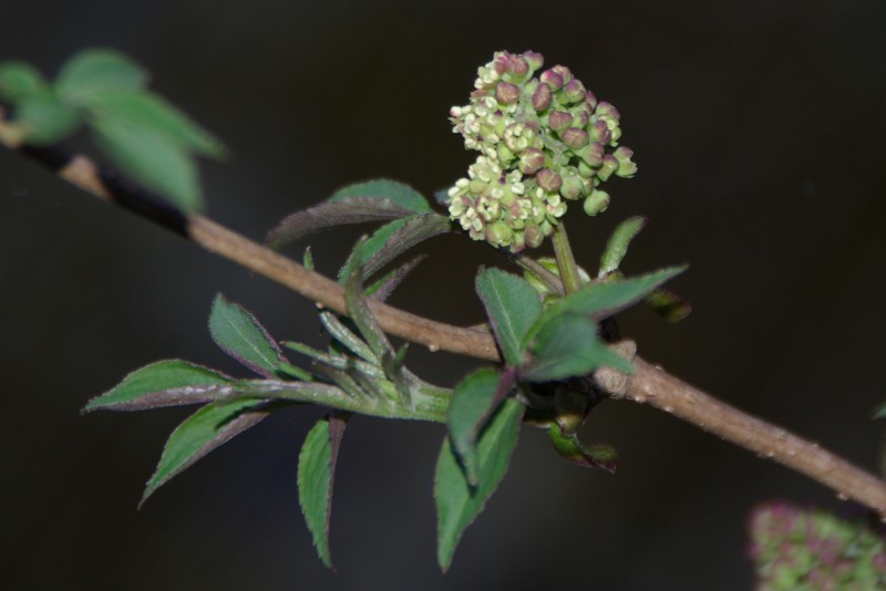 落葉低木または小高木です。春先に新芽と花をつけます。花はクリーム色の小さな花が多数集まったものです。6〜8月、