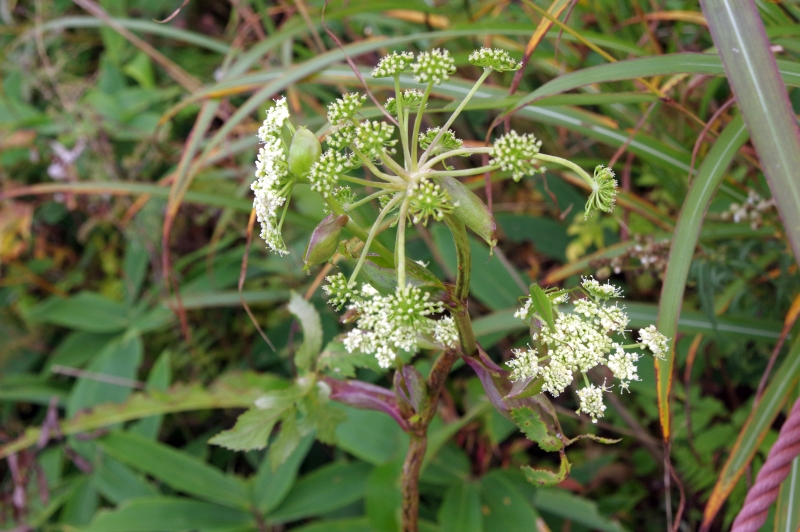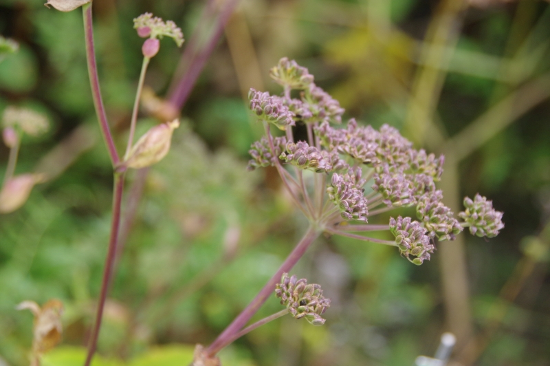 小さなシシウドで、同属では遅い目の9〜11月に咲きます。花は紫褐色が一般ですが、