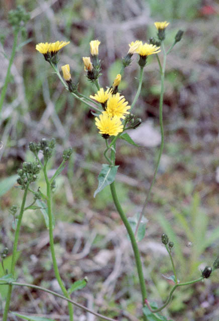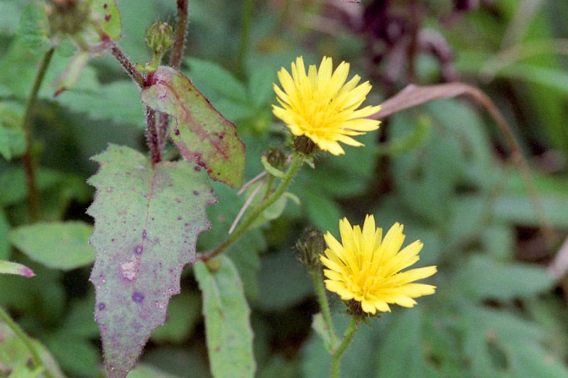 4〜7月ごろ、道端や畑の端などにどこにでも咲いている花です。頭花は2cmほどの大きさです。花のあと、タンポポのような綿毛(3)ができます。