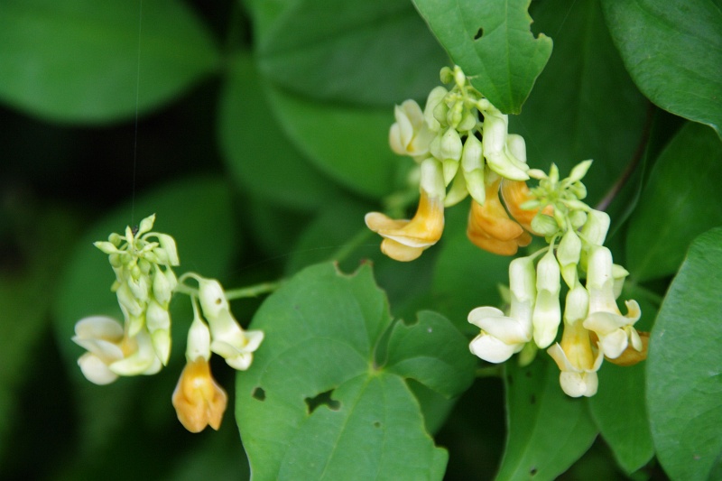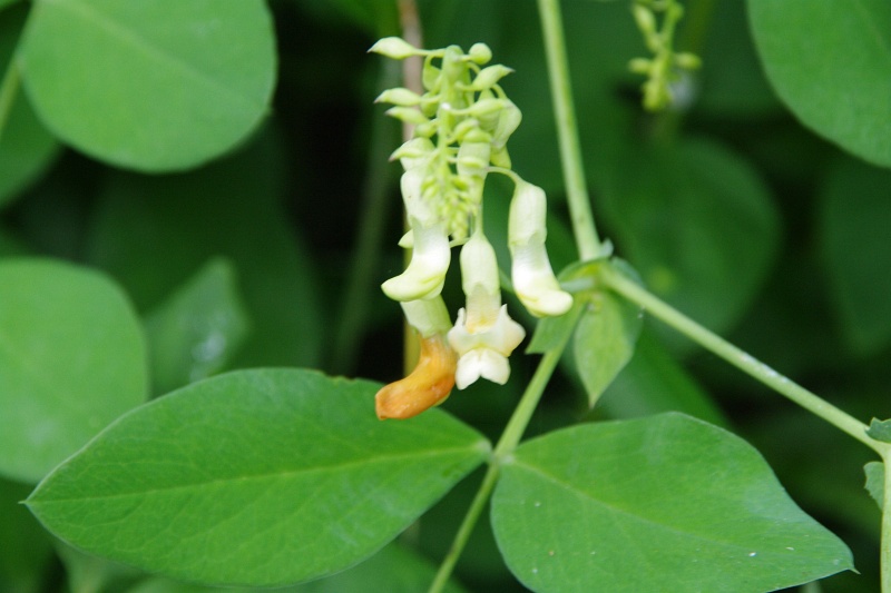 白〜黄色に変色する花が咲く、マメ科の植物です。秋になる実は、