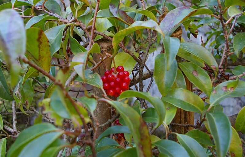 秋、小さなボールが集まって大きなボールを作ったような赤い実が目立ちます。4は熟す前の青い実。