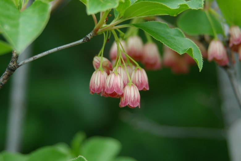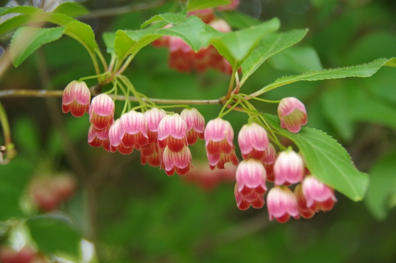 更紗満天星。6月、一房に花を5〜10個つけます。花冠は長さ8〜12oで先が5裂し、淡紅白色に赤い縦筋があります。