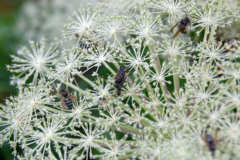 白くて細かい花を付け、花上にはアブやカメムシ、ハチ、時にはカミキリムシがやってきます。