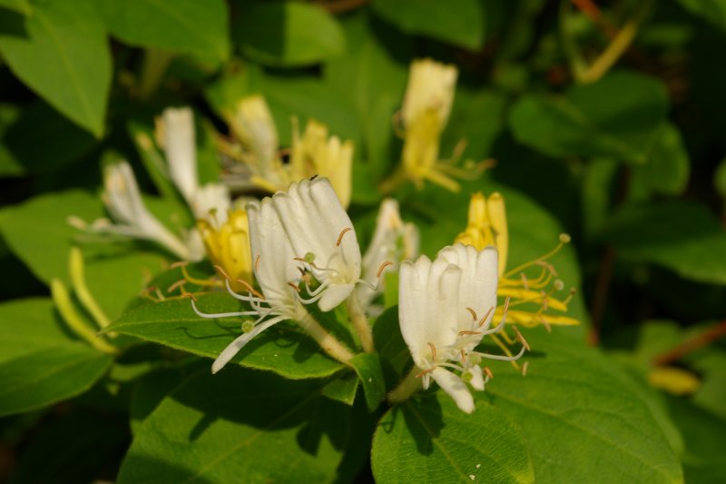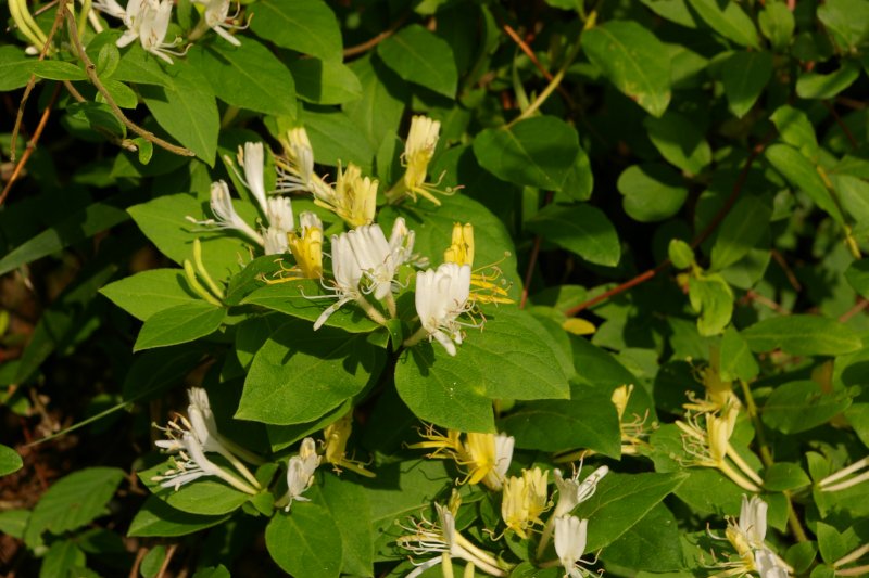 かつて、蜜が甘くて吸ったのでスイカズラとなったそうです。枝先の葉腋に甘い芳香のある花を2個ずつつける、