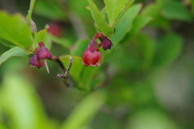 6〜7月、枝先に緑白色〜紅色の鐘形の花を1〜4個下向きにつけます。
