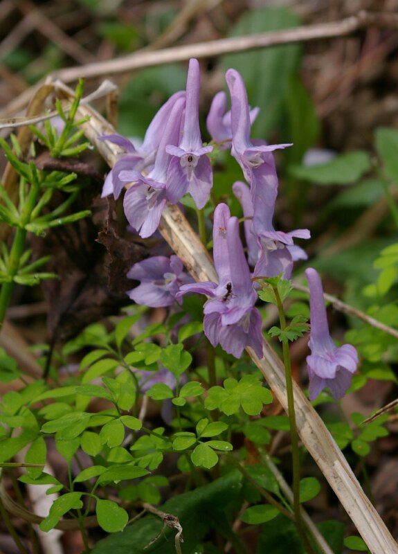 後方に延びる筒状の距がユニークでおもしろい花です。近縁種にムラサキケマンがあります。