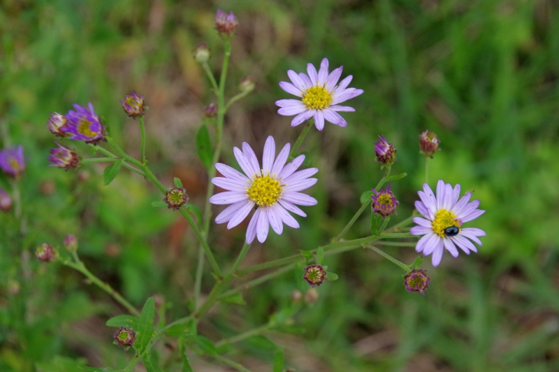 秋に咲くキクの仲間の一つ。花は青紫色〜白で、直径3cmほど。田んぼの畔など、やや湿ったところを好みます。