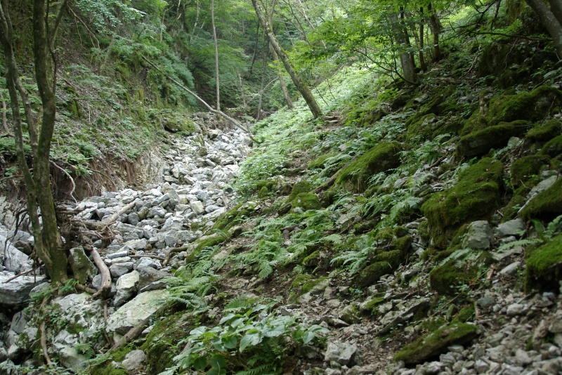 このあたり、河床は上から流れてきた石灰岩でいっぱいになり、ルートは左岸の山腹につけ替わっています。
