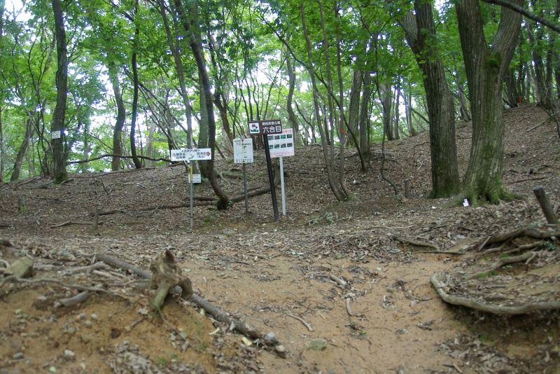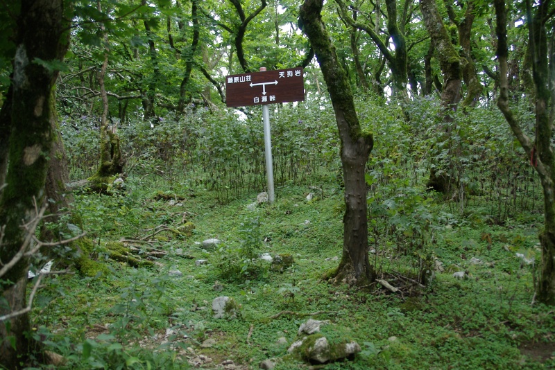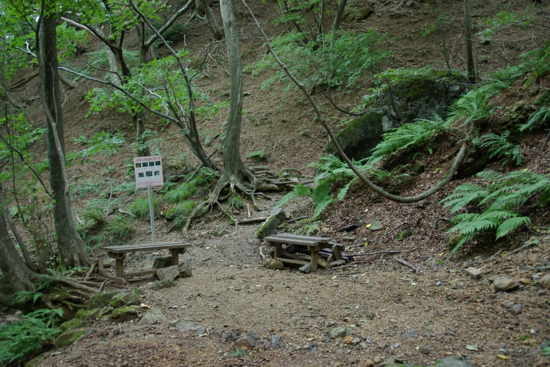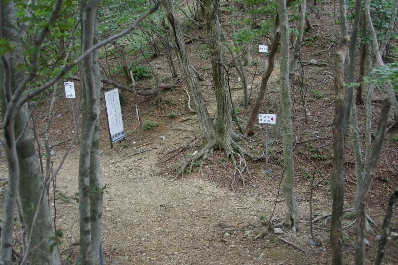 一旦下って白舟峠です。大きい看板は左に下る坂本谷道の通行止めを書いた看板です。右は真の谷へ下る道。