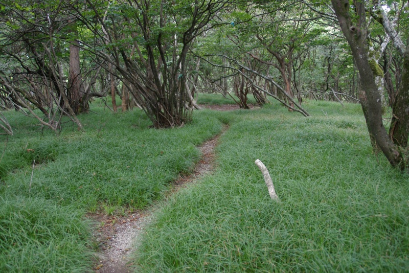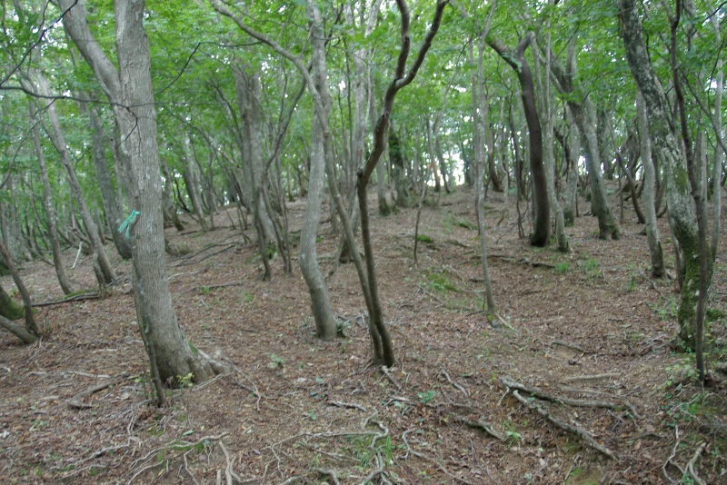 まずここと気づかないくらい平らな稜線です。イワカガミの葉が繁っています。花の頃は綺麗でしょう・・・