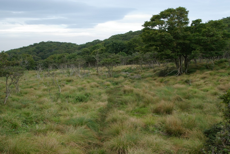 やがて稜線は右方向に離れ、なだらかな源頭部のような草原に出ます。このあたりにはカワチブシ(トリカブト科)が咲いていました。