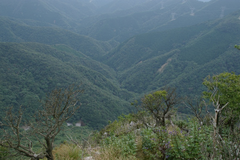 天ヶ平(カタクリ峠)から先の県境稜線はよく整備され、雰囲気も素晴らしい稜線です。高圧電線の鉄塔のある冷川谷の頭(頭蛇ヶ平)は、眺望抜群ですがそのぶん風が強く、8月下旬とはいえ寒くてお弁当をさっさと切り上げました。ビールも冷たかった・・・しかし、ここは北鈴鹿の展望台と言っていいでしょう。なんと言っても威風堂々の御池岳・テーブルランドが目の前に。その左には天狗堂と土倉岳、日本コバに綿向山も望めます。右には霊仙山、伊吹山・・・・