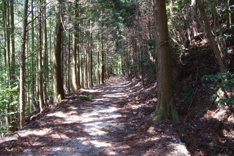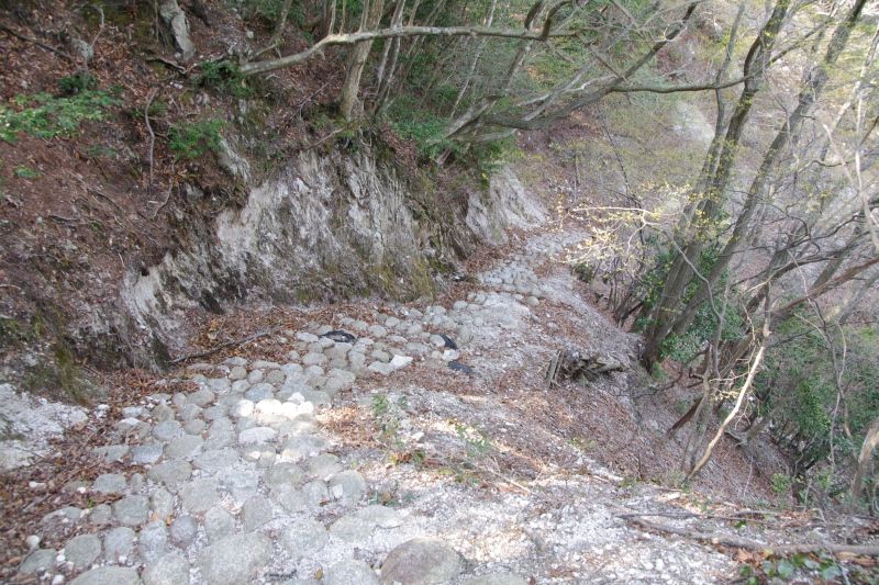 もう少し先で、分岐点です。谷には大きな石積みの堰堤が見えています。まっすぐ進むと旧国道に出て、石榑峠方面です。ここは左へ。