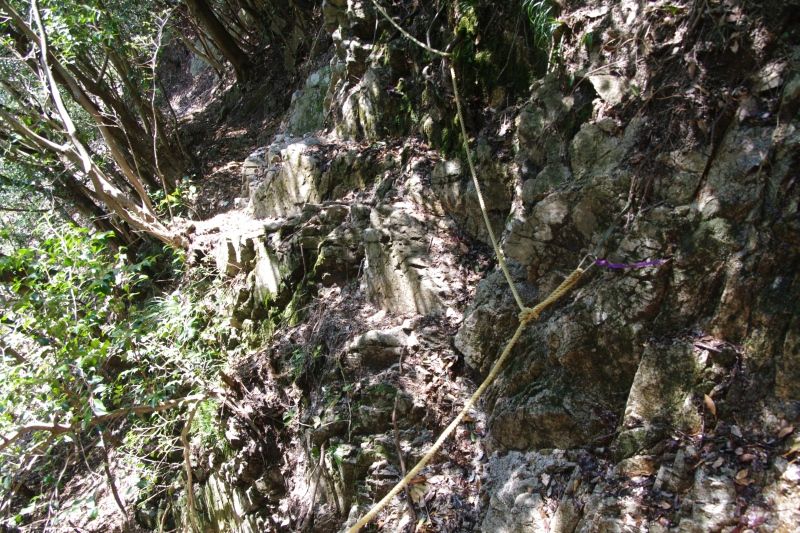 滝を過ぎると、虎ロープで岩を乗り越え、山腹の道を進みます。あまり幅がなく、ちょっといやなところ。