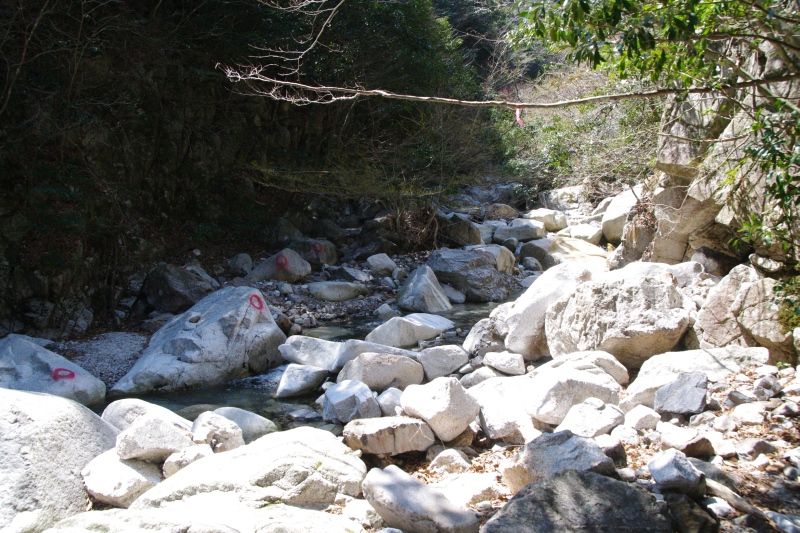 竜ヶ岳への中道の分岐を過ぎ、しばらくで川に出ます。テープとペンキを確認しながら渡渉を数回繰り返します。