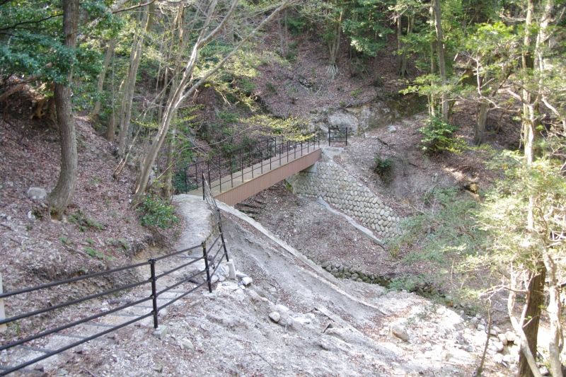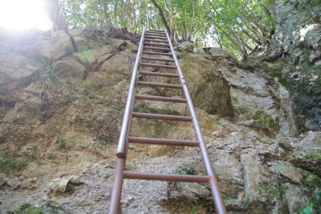 さっき見えていた涸れ谷を登り、左手へはしごで登ります。長尾滝の高巻きです。