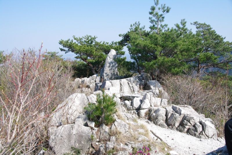 やがて、砂山の山頂展望台です。標高は497m。指差し岩のような岩が目印。