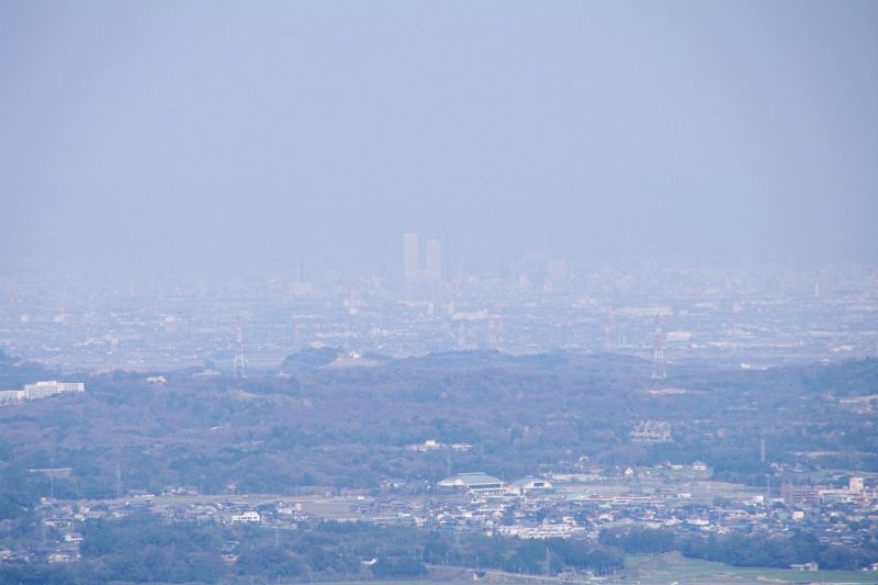 見晴らしのいい所にベンチがあり、そこからは名古屋、四日市などが。これは名古屋駅のタワーです。
