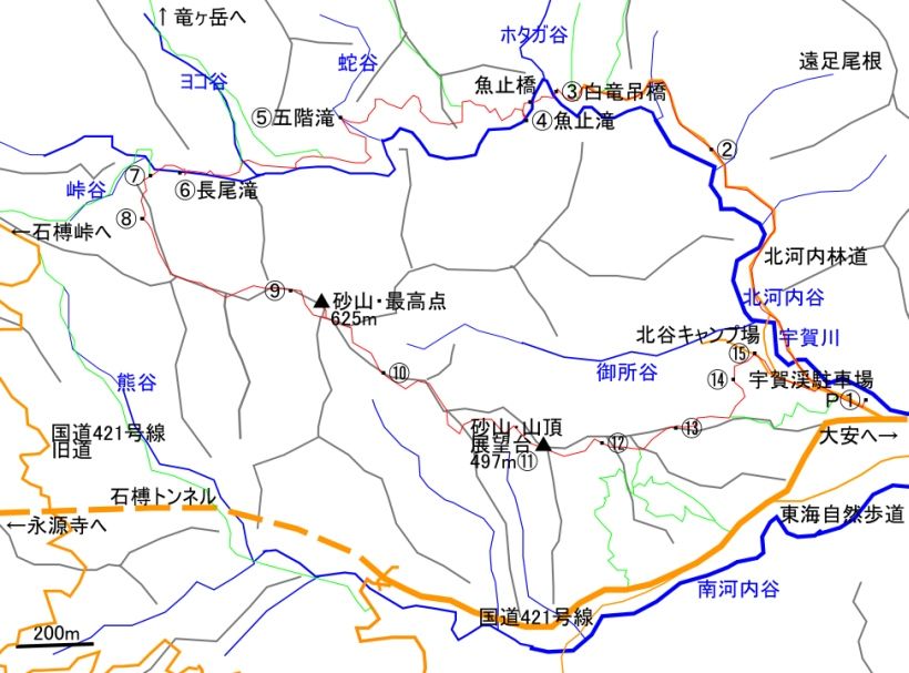 休憩をゆっくりとっても5時間ほどでまわれる周回コースです。宇賀渓は滝が多く、水量も豊富な谷で、見ごたえがありました。特に長尾滝はなかなかの名瀑と言って良いのではないでしょうか。C〜Fでは多少足場が悪いところがあるので、要注意です。砂山は一般的には497mの展望台のところが山頂とされているようですが、山体としての最高点は、ずっと北西寄りのH-I間にあります。アカヤシオは、やはりH〜Iで咲いていました。このあたりにはミツバツツジは見られず、うまく棲み分けをしているようでした。