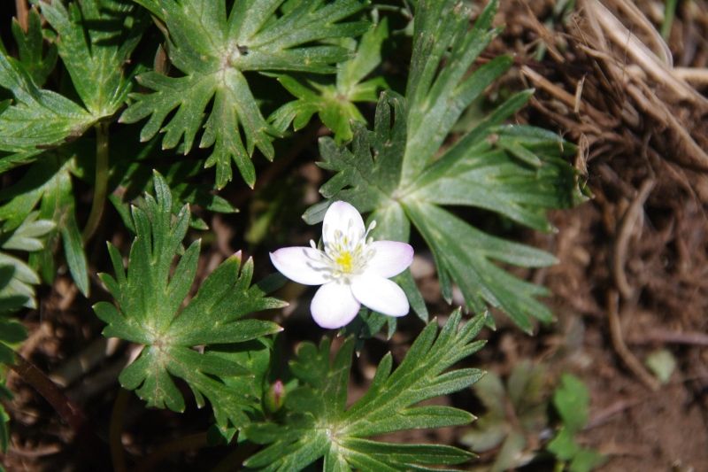 雪割草とも呼ばれる可憐なミスミソウです。近江展望の下の斜面に群生しています。名前の由来となる三角の葉っぱが写ってます。