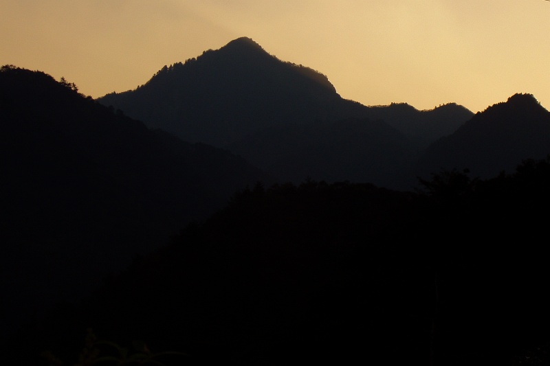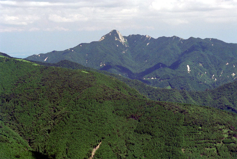 上の写真の望遠版です。水沢岳の向こう側、やや右奥に台形の宮指路岳946m、