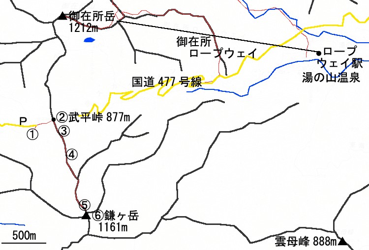 トンネル脇登山口@、9:25 武平峠A、10:15-40 鎌ヶ岳山頂E、11:30 武平峠、11:35