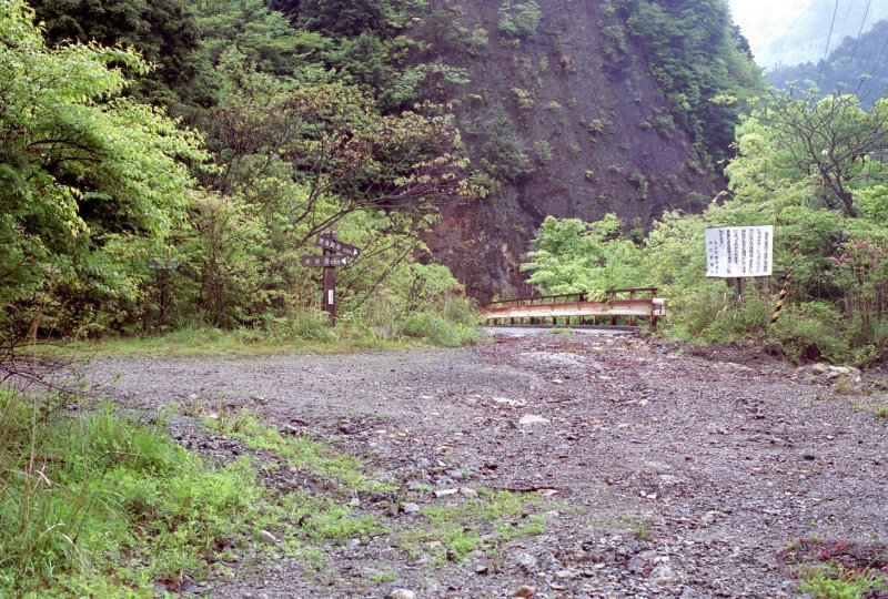 朝から雨でした。10時頃、空が少し明るくなって雨がやんだので、とりあえず車で鈴鹿スカイライン(R477)に向かいました。しかし、日野あたりで再び雨になり、かなり強く降ってきたので、今日は下見に留めようと、お弁当も買わずにスカイラインをのぼっていきました。野洲川ダムを過ぎ、さらに進むと右手に小さな橋があります。この橋が大河原橋です。狭い関門を抜けて元越谷林道に入り、車内からしばらく様子を見ていると、雨がやみ、薄日が射してきました。急遽予定を変えて登ることにしました。お弁当を買ってこなかったのが心残りでした・・・・