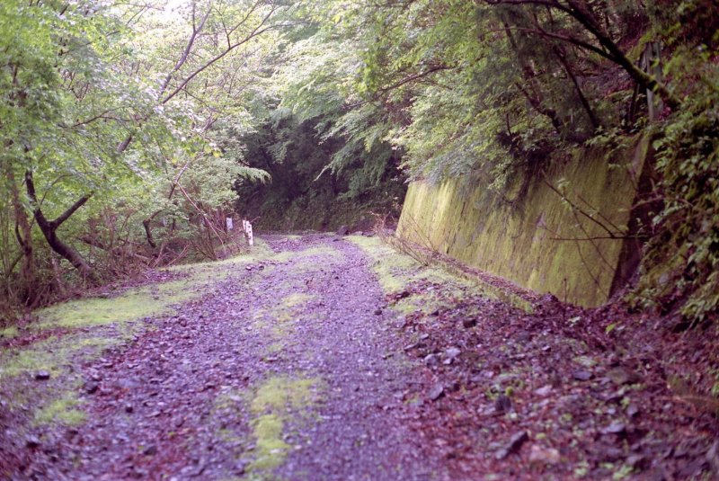 苔むした林道の擁護壁。傾斜は緩いですが、結構な距離があります。