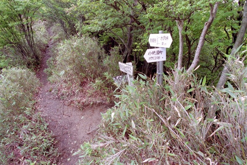 山行記録:日時−2002年5月19日、天候−雨のち曇り。11:45 元越谷林道入口付近Pに駐車、出発、13:15 NTT電波塔D到着、13:35 林道・県境尾根への分岐点E、13:45 小岐須峠G、14:00 宮指路岳山頂H着。14:45 山頂発、15:05 林道・分岐点G、16:15 駐車地P着。