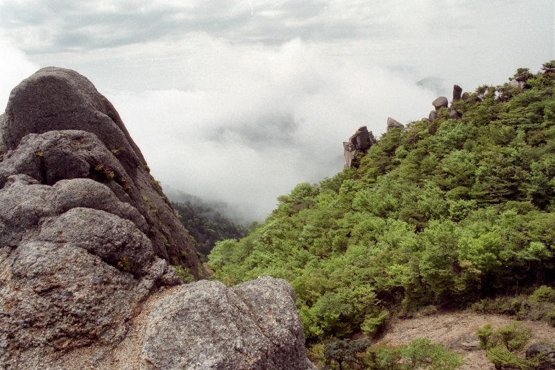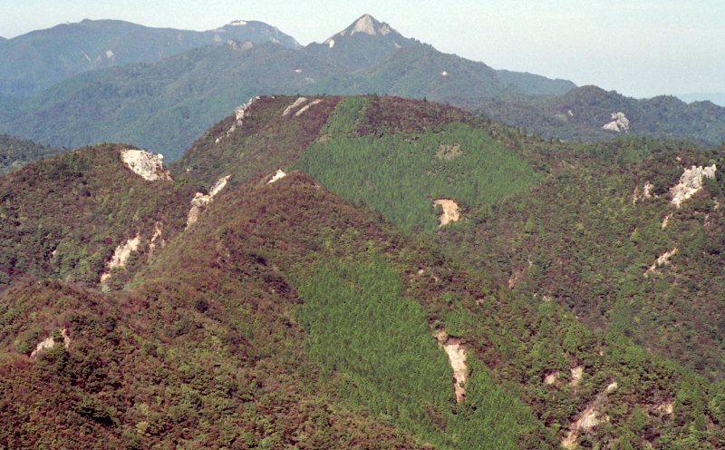展望岩は、ピーク左端の岩。その右に馬乗り岩も見えます。2001.10
