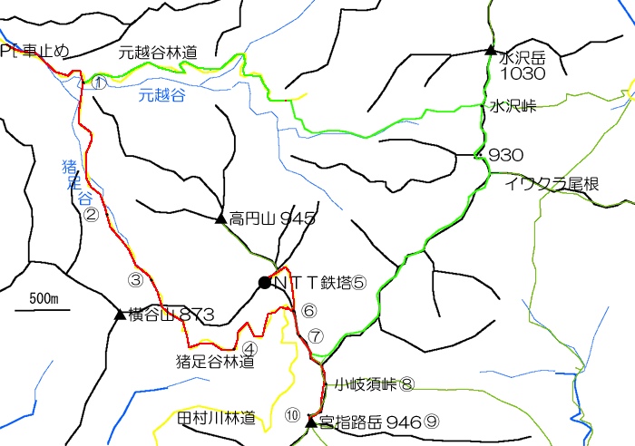 宮指路岳(946m)の名前は、その標高から付いたもので、滋賀−三重の県境上にある鈴鹿南部の山です。三重県側からは、小岐須方面からヤケギ谷、もしくはカワラコバ道がありますが、滋賀県側からは縦走路を除き一般登山道は無く、林道を詰めていくしかないようです。ここでは元越谷林道・猪足谷林道を経て小岐須峠に達し、宮指路岳に至るコースを紹介します。写真の後ろの丸数字は、最後の地図の番号と対応しています。