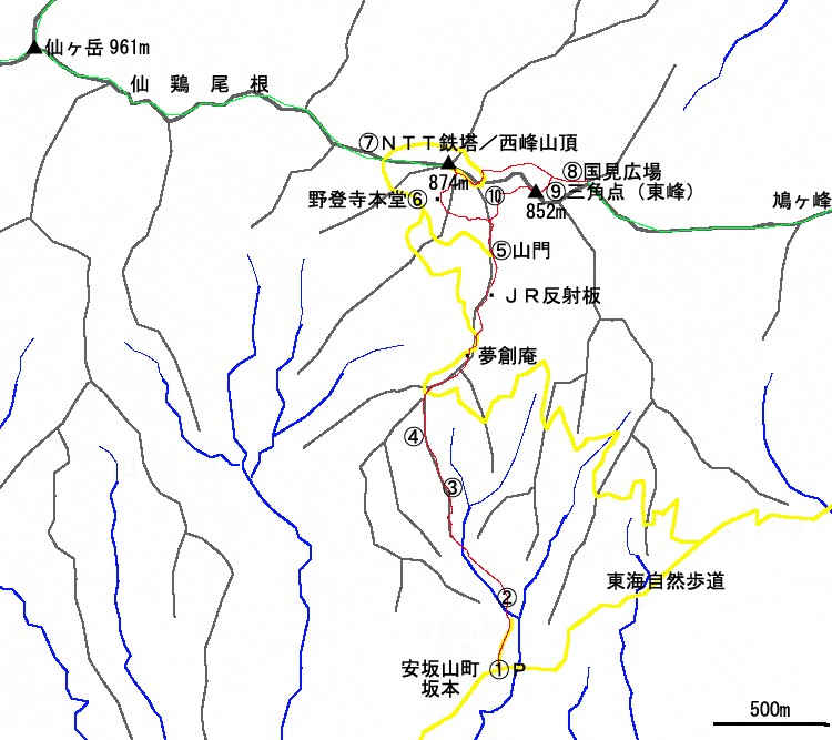 山頂近くに野登寺(やとうじ)という古刹をもつ野登山、地元では敬意を込めて「ののぼりさん」と呼ばれているようです。鈴鹿主稜線上の仙ヶ岳から東の三重県側に延びる仙鶏尾根の先にある峰です。その先にはさらに鳩ヶ峰がありますが、採石で削られ、哀れな様相を呈しています。また野登山頂には巨大な電波鉄塔が3つあり、しかも舗装された林道が山頂まで登っており、その点はずいぶん興ざめですが、坂本からの古い野登寺参道が登山道として残っていますので、できるだけそれに沿って登っていきます。この日はあいにく小雨がぱらつくお天気でした。