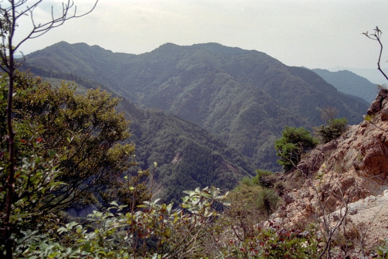 三ツ頭の山頂東から。伊賀山地の名山・錫杖ヶ岳です。後方に伊勢湾が広がっています。