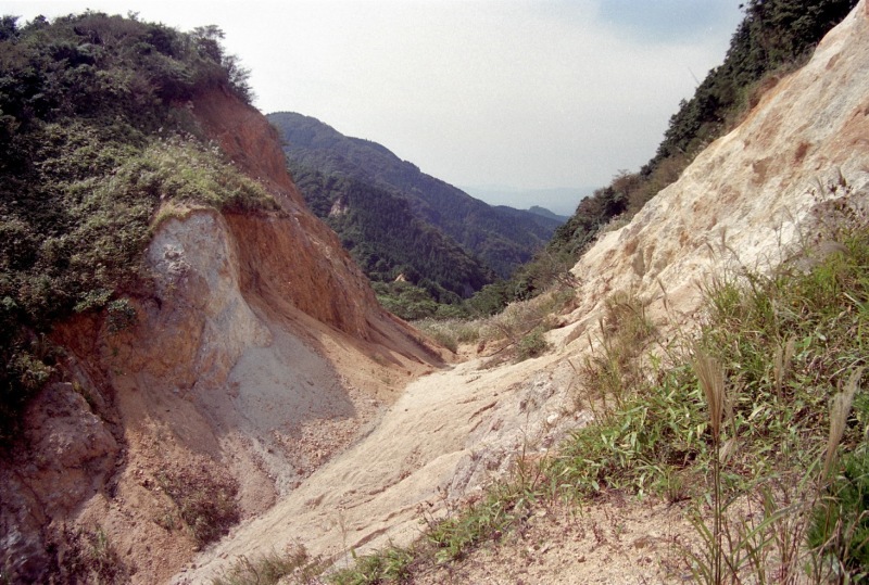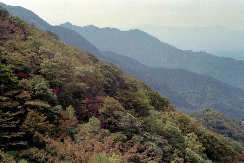 まだまだ暑い9月末、林道は大原ダム上流で崖崩れを起こし、参詣橋の15分手前のところから歩かざるを得ませんでした。参詣橋から坂下峠まで約45分。蝉時雨の中を登るにつれてだんだんと林道は良くなっていきましたが、U字ターンを2回終えたあたりで急に舗装路は終わり、そこから先は荒れ切った道でした。坂下峠を越えたところから左側の山腹に取り付くと、まさに急登。ガレ場を巻くコースで木の根っこを頼りにどんどんと登っていきます。尾根に戻ると眺望が開け、那須ヶ原山、唐木山が真後ろに見えます。溝干山の山頂は狭く標識一本あるのみです。ここから一旦急降下して、稜線上のコースになります。笹が茂ったなかなか素晴らしい道です。半時間足らずで高畑山頂に着きます。北は雨乞、鎌、南は今越えてきた溝干、那須ヶ原、更には伊賀の錫杖岳、西は飯道山、阿星山。この日は残念ながら薄雲が出ていましたが、薄雲が晴れたらさらに素晴らしいことでしょう。