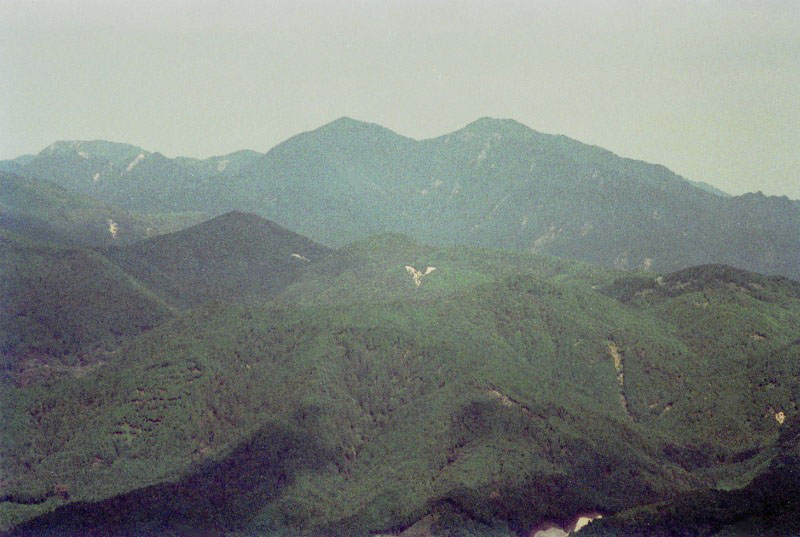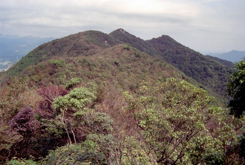 中央左寄りが四方草(しおそ)山。その手前、真中の鉄塔の後ろに三子山の中峰。その左右に北峰と南峰。